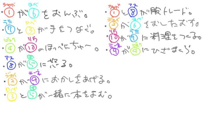 バトンバトンwwそして地雷www(わら すみませんもし持ってきたとお気づきになったら貰っちゃいましたすみませんorz まぁ見てないだろーけど!!(悲 とりあえずティアクラでやってみた。。時間あったら他のもやりてえww(笑 つかもうこんな時間だよ早くしないと2時間も寝れねええええ急げウチ!!><: 阿弥陀だよー。まちがえた。アミダだよー。。 ・シャバックがヨベおんぶとか可愛すぎる・・・!!wwww ・ラミンとロベ手つなぐ可愛いいいいいいいい!!!!やっべえかわいいどうしようやっほう!!(きもす ・ビュクセが!リウに!!ほっぺちゅー!!ww(笑)どんな状況だよww意味不明すぎるけどかわいいからいいやww(笑) ・アスアドが団長に怒ります。。多分戦闘中に団長がロベルトばっかみててふぬけてたからだぜww(うわ)もしくは一人で突っ走ったとかメルヴィスに余計な事言ったとか・・・www(笑 ・ジェイルがミーネにお菓子あげるとかよくわかんねwwでもなんかかわいいww ・ロベと団長が一緒に本読む!!絡みきたああwwwでも個人的にはもうちょっと刺激的なものがyr ・シャバックとアスアドが服交換wwなんか想像つかなすぎるww(笑 ・ジェイルがヨベル押し倒すとかどんな状況だあああリウに怒られるぞ!!←あれーウチ的にヨベルは上なのになーでもジェイルとだったら下かー(あーあ ・リウがラミンに手料理wwどんな罰ゲームだww(笑)ラミンに罵倒されまくりそうだww(笑 ・ミーネがビュクセに膝枕ああああキタああああ!!!wwww狙ってないよ!!狙ってないんだからね!!(笑 よし、こんなカンジだwwもっと女の子キャラ入たかったけどメルヴィスとかツゥベルンとかイクスとかも入れたかったけど10個ってなかなか少ないね!!← とりあえず多分これら描くよ!!好きな順から!!(うわぁ まあ期待しないで待ってて下さいww |