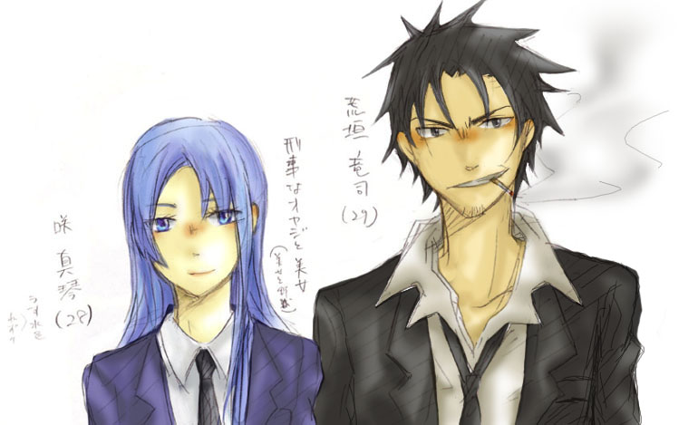 新キャラ?でもないけどまだ紹介してなかったキャラの絵が塗り終わったんで紹介>< ではいきます。。 (右) :荒垣 竜司(あらがき りゅうじ) 29歳 1月24日生まれの水瓶座のB型。 職業は刑事。 9年前のまだ新米刑事の時に、脱走中の廉と爛に出会い助ける。 それ以来、主に仕事の依頼や情報などずっと二人に協力している。 大雑把で投げやりな性格。 上下関係など関係なく対等に接するタイプ。 基本面倒くさがりだが、困っている人には何かと手を焼いてしまう。 子供と女性は苦手。酒好き。部屋は汚い。オヤジくさい。(笑 (左) :咲 真琴(さき まこと) 28歳 5月15日生まれの牡牛座のA型。 竜司と同期の女刑事。 温厚で気立ての良い性格。 何事にも冷静で責任感と忍耐力が強く、自分で決めた事は最後まで貫くしっかりもの。 竜司と共に行動する事が多く、最初に廉と爛に会った時にも遭遇していた。 雑な竜司を上手くカバーしている。 実は強い。怒ると怖い。 こんなカンジです・・・;; 遊戯王見てて時間かかった・・・!(おい 十代かわいい!!!www(うわ 上の絵はホント適当な人物設定に色塗っただけなので、もっとちゃんとしてるのも載せます;↓↓ なんか真琴さん若々しくなった・・・;;うーんこんなもんかな??(笑 竜司さんは30代にも見えなくもない感じに描いてるのですが・・・どうだろうか・・・;まあこんなカンジです。。 描いてて楽しいキャラ上位ですねww竜司さんとかww 他は駿吾や兎未や奏や暦や響さんが楽しいですねえww(おい主人公は;; 主人公達一番描き難い・・・(おおい; あと猫柳とチハヤと七瀬描き難い;;(チハヤのハヤ漢字どう出すんだっけ・・・;) まだまだよろず屋絵も増えてきますよー沢山描いてあるからww(笑 でわ><